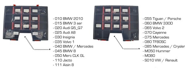 The case contains adapters for the most common automatic transmission types (incl. CVT and DCT).
