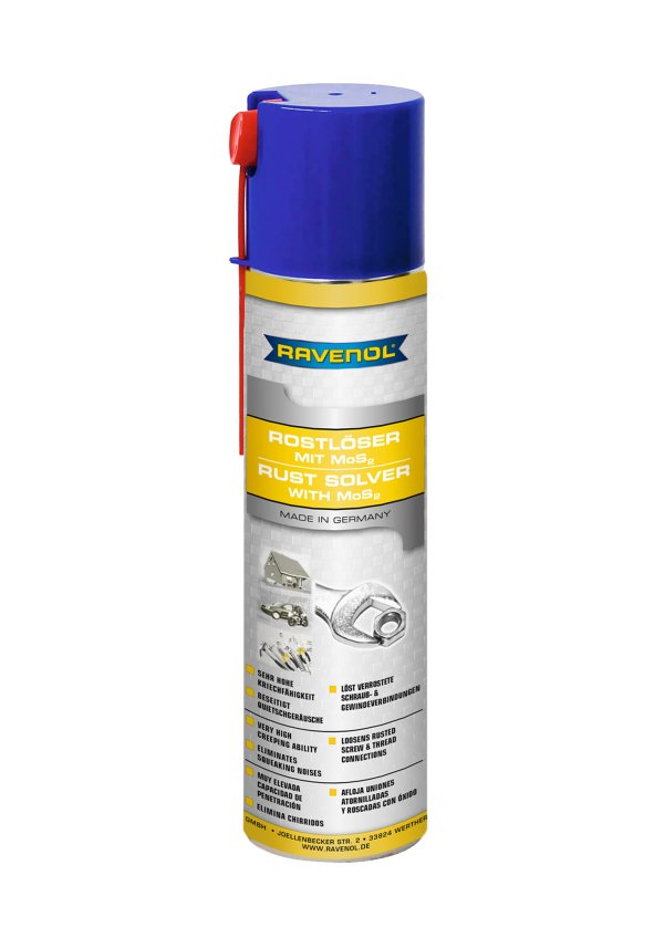 RAVENOL Rostlöser MoS2 Spray is designed for the effective loosening of rusted connections, seized bolts, hinges and locks as well as offering short term water and moisture displacement from ignition contacts and electrical systems. Contains finely dispersed molybdenum disulphide (MoS2) solid lubricant for excellent lubrication properties and to provide long term protection against squeaks and creaks.