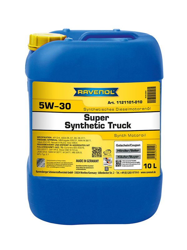 RAVENOL Super Synthetic Truck SAE 5W-30 is an all-season Low SAPS high performance commercial vehicle motor oil fine tuned for the new exhaust emission directives. All-season use in EURO IV, EURO V and EURO VI engines.